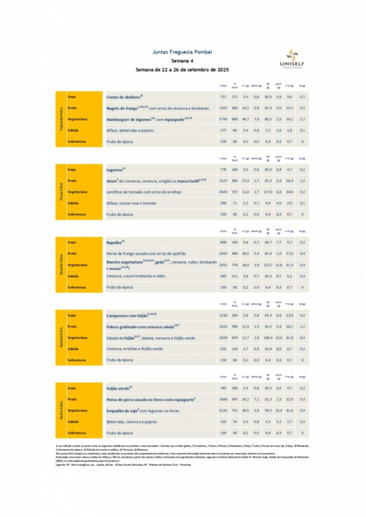 Ementa Centro Escolar de Almagreira e Jardim de Infância da Assanha da Paz | Setembro e Outubro 2025